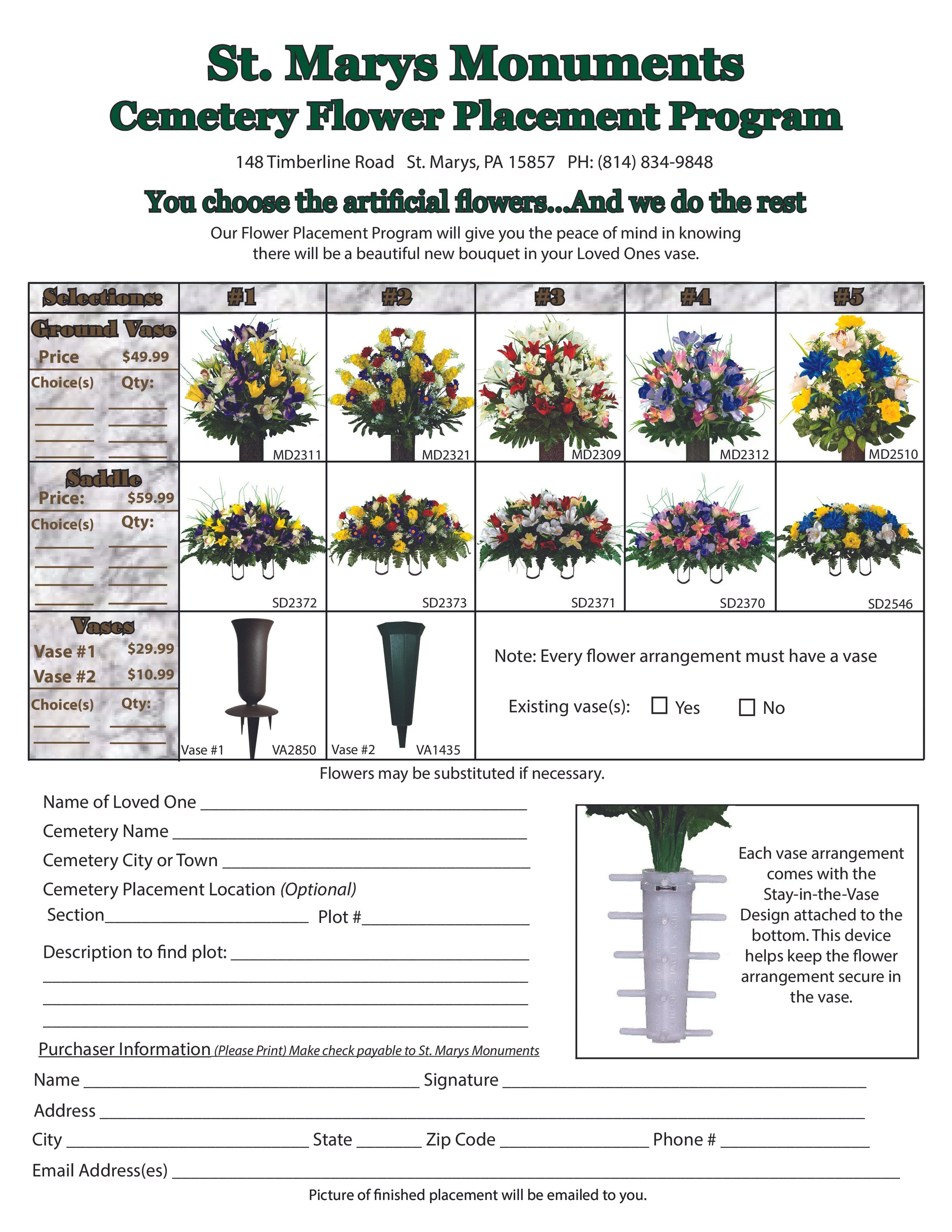 The Flower Placement Program is for people that live in the area or even out of town that can't make it to the cemetery but still want their loved one's headstone to have beautiful artificial flower arrangements placed once a year or as often as you would like.